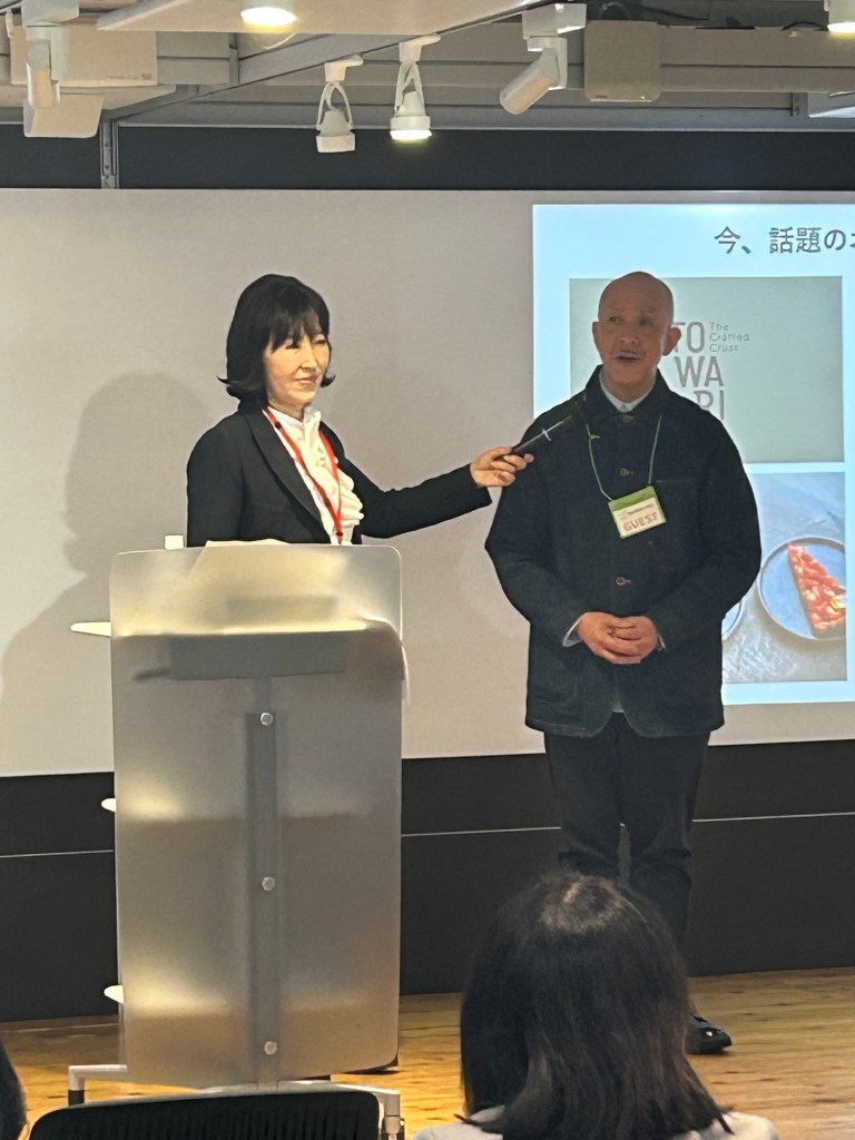 静岡の食はこのタルトのイチゴにしても地産地消ものが多いのですが、五條さんは、捨てられてしまう静岡の酒粕に着目し、その酒粕をタルト生地にできないだろうかということでこれから挑戦されます。お酒にも合う、ワインにも合う、そんなものを作りたいという志を持って焼いてくださった試作品が今日この後出ます。その五條さんを紹介します。五條さんも静岡の出身で、静岡で育ててもらったそうです。